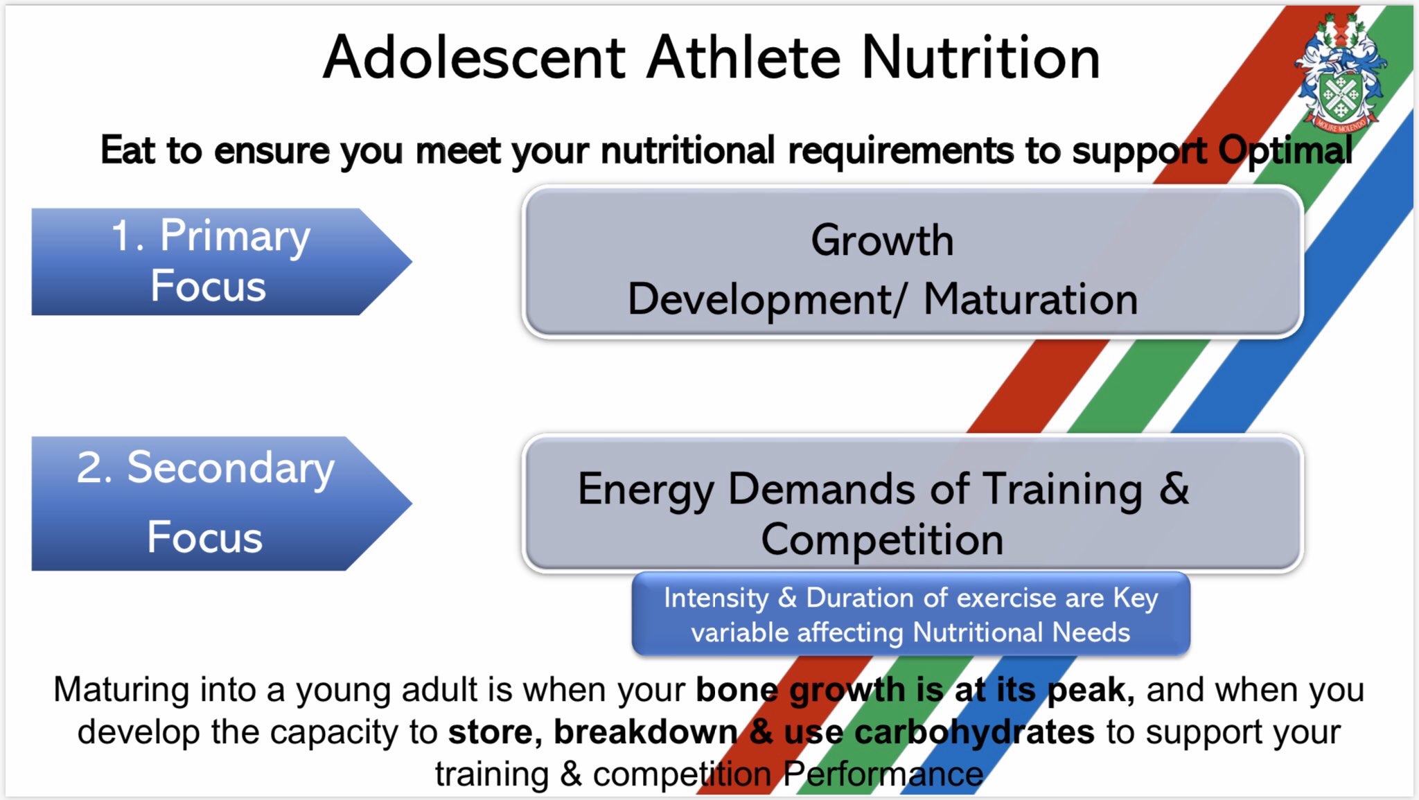 Evidenced-based nutritional practices are integral to support a young athlete’s training and performance. For senior performers, the balance between their energy intake and demands of training, recovery and performance is key. However, energy requirements in young people is multifaceted, with elevated energy needs to optimise growth and maturation. Equally high nutrient needs are prevalent to ensure all bodily systems develop at their optimal rate moving through maturation. In addition, the energy demands associated with training, multi-sport participation and free-play in a school environment create a unique yet complex nutritional profile for the developing young athlete. Thus, the primary nutrition focus for young people in sport and their support personnel should be to ensure energy requirements are met, followed by a consideration of the sporting energy requirements.
